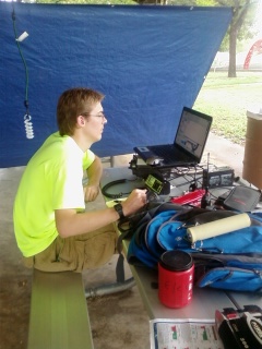 Equipment: HP2000 Laptop Computer, IC-706MK2G, Signalink USB interface, Micronta SWR meter 3 to 30MHz, 20/40/80m inverted V homebrew antenna, 20m single band inverted V antenna, backpack vertical adjustable whip antenna with assorted coils for multi-band operation, several different 12v batteries for power source, laptop only plugged into commercial power, RG8 coax. Boatload of extra parts/odds and ends. Next time we will have a voltage booster for a steady supply of 14v and an automatic antenna tuner.