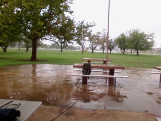 Wind from the blue side mostly, rain coming through the roof back there, but tarps blocked the splatter. Clayton Knapp KA9CPB came out for lunch and loaned us another tarp which we put to good use when the wind changed direction.
